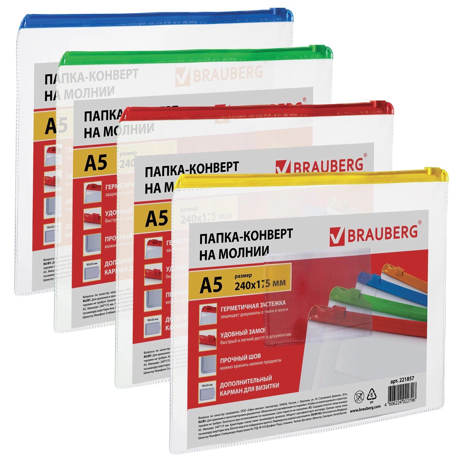 Папка-конверт на молнии А4 (335х238мм),карм д/виз,молн ассорти,прозрач,0,15мм,BRAUBERG"Smart",221856