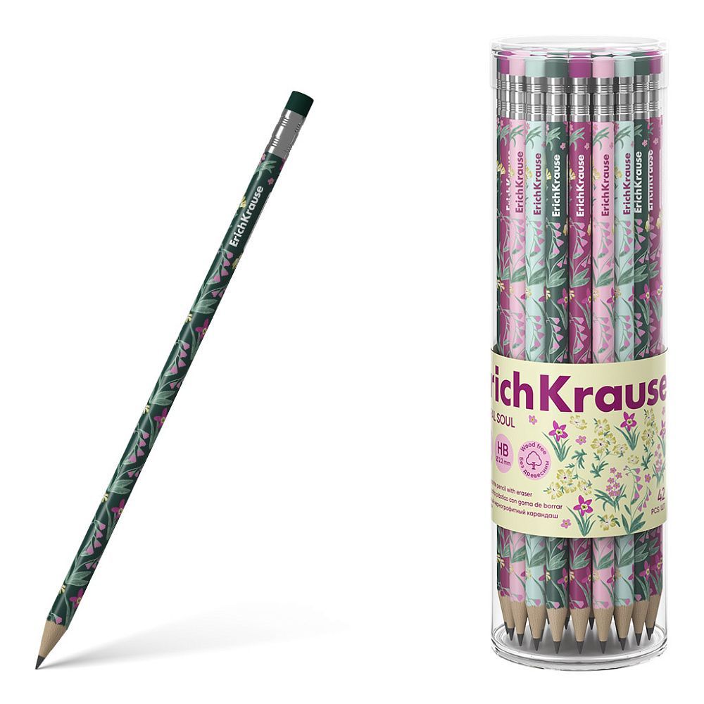Чернографитный карандаш пластиковый ErichKrause Floral Soul, круглый, с ластиком, НВ